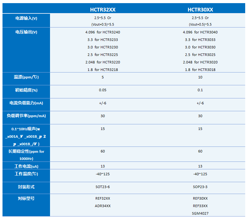 HCTR3XXX为一款高精度、高性价比基准电压源,初始精度为0.1%,其既可用于给 ADC 芯片提供基准电压,也可以给 MCU、ADC、桥式电阻传感器等其他芯片或电路提供恒定的供电,供电电流需在+/-6mA 之内。其供电电压的准确度和噪声相比于 LDO 具有明显优势。